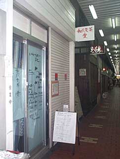 こまつさんに教えてもらった和風喫茶「愛」はモトコー4にある。 ![]() 2004年10月4日撮影 ドアを開けて一歩中に入る(おっと、入り口で靴を脱いでね!)と、そこはお釈迦様でも出てきようかという風情であった。 すでに店主のお友達とおぼしきご婦人方が会食中であった。お昼のメニューは「だしまき定食」と「おまかせ定食」(それぞれ680円)があるらしい。ご婦人方は「おまかせ定食」をチョイスされていたようで、美味しそうだったので筆者もそれを注文。 ![]() ここをクリックすればもう一枚ご覧いただけます。 メインディッシュの「かんぱちの塩焼」、「トマトスープ」、「ごはん」等が運ばれてきて、これでお終いかと思えばさにあらず。ご覧の通り八つの皿(容器)が並ぶことになった。どれから手を付けてようかと正直迷ってしまった。とにかく惣菜の数が多い。どちらかと言えば家庭的な味である。 ごはんはお代わりOKとのことであるが、お腹がいっぱいになってしまった。 知らない者同士でも、すぐに会話に入っていける雰囲気がこの店にはある。
